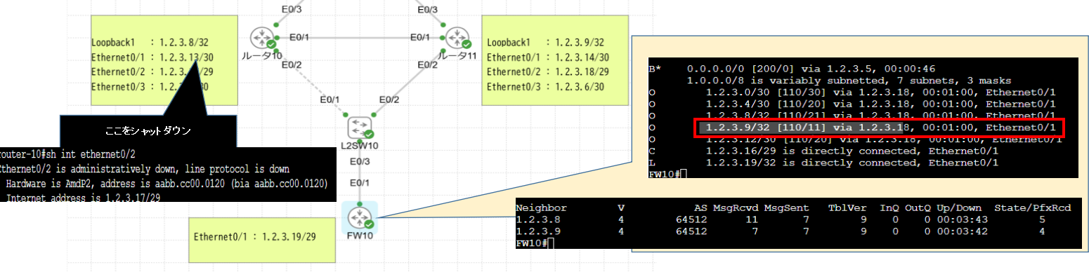 ケ はルータ10・11、FW10への設定で前の問題などで、BGPを構築する前にOSPFを組まないとループバックインターフェースの広報が無いことが解っていますので、OSPFの導入となります。