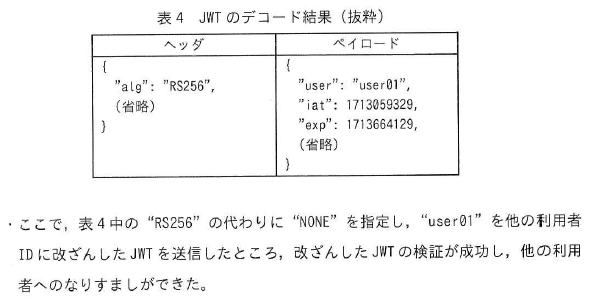 今回の問題はJWT のヘッダを改ざんし、署名アルゴリズムを「RS256」から「NONE」に変更して、署名検証を無効化し、ペイロード内の利用者 ID を勝手に書き換えてなりすましができてしまっています。