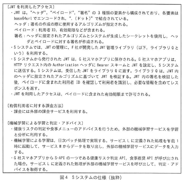 問題 表5中の下線①について、修正後のライブラリQで行うJWTの検証では、どのようなデータに対してどのような検証を行うか。検証対象となるデータと検証の内容を、それぞれ20字以内で答えよ。
