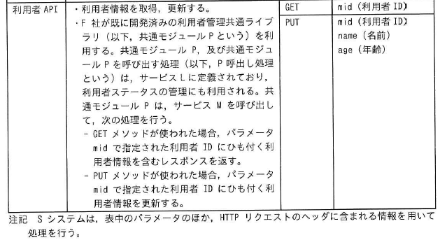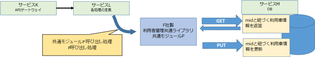 利用者APIの仕様を確認するとサービスLが共通モジュールPを呼び出して、共通モジュールPがサービスMを呼び出して処理を行うとなっていますので、処理を行っているのは共通モジュールPとなります。