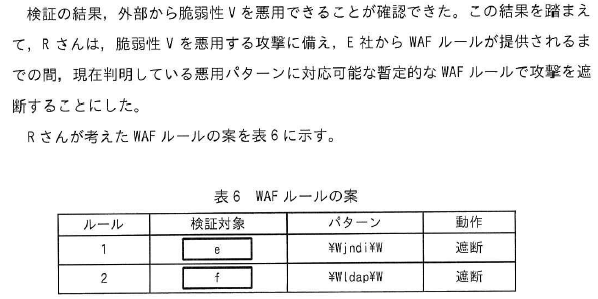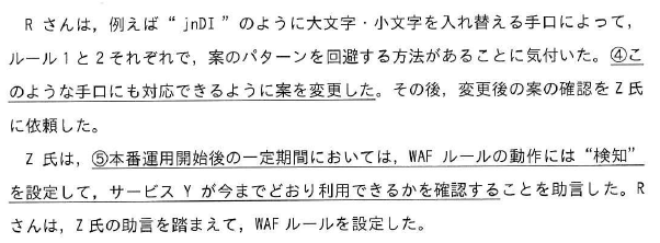 問題 本文中の下線⑤について、WAF ルールの動作に “遮断” ではなく “検知”を設定することによる利点と、 “検知” に設定した際に被害を最小化するために実施すべき内容を、それぞれ25字以内で答えよ。