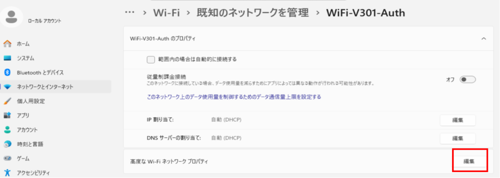 設定 > ネットワークとインターネット > WiFi > 既知のネットワーク > 対象のSSID