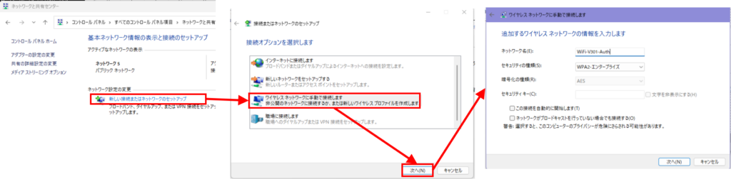 コントロールパネル > ネットワークと共有センター > 新しい接続またはネットワークのセットアップ > ワイヤレスネットワークに手動で接続します