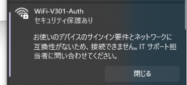 PCで新しいネットワークの設定をしない状態で、TLSしか対応していないSSIDに接続すると、下記の様なエラーになります