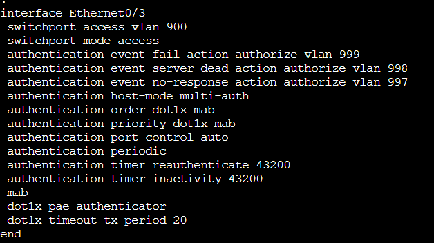 | (config-if)#switchport access vlan 900 | 認証に成功した端末はVLAN900 に割り当てられる |