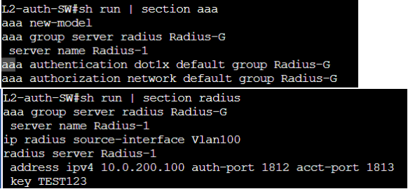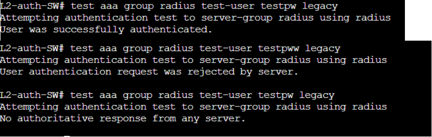 L2-auth-SW# test aaa group radius test-user testpw legacy
