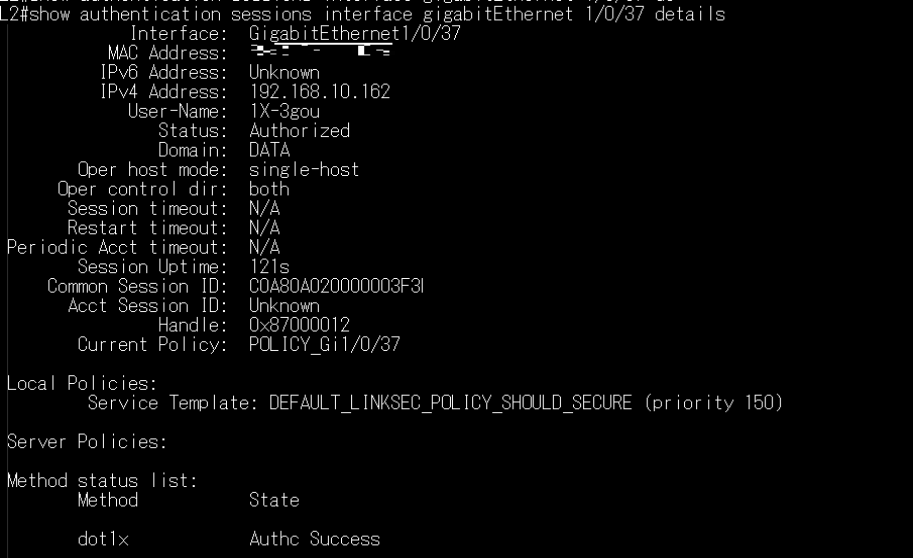 コマンド:show authentication sessions interface <I/F名> details