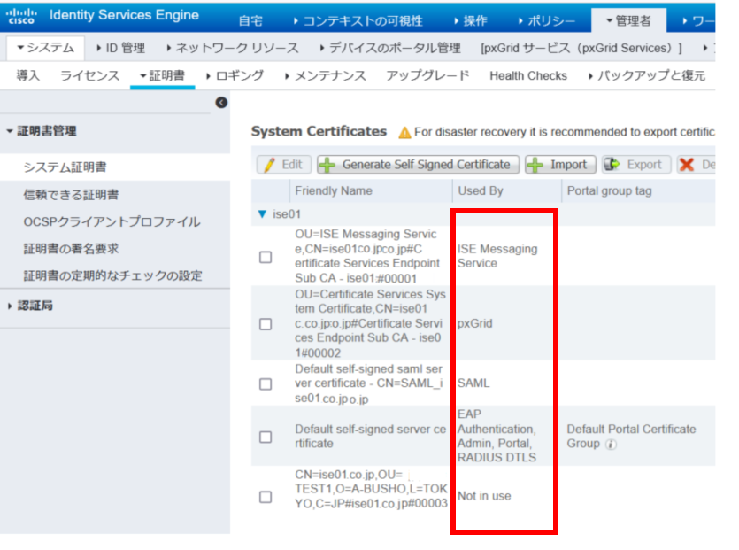 管理者 >システム > 証明書 >システム証明書 で証明書の使用用途が確認できる