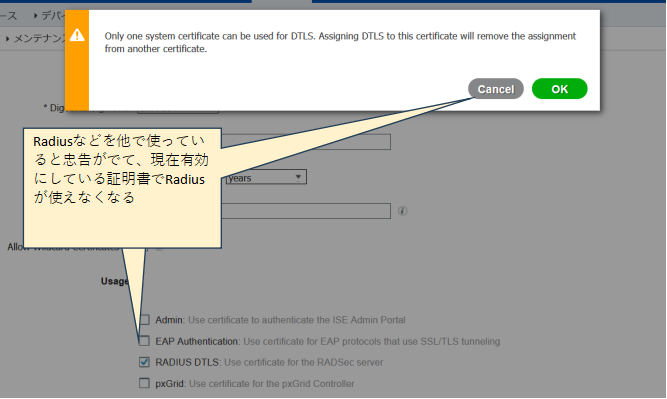 新しい証明書をRADIUSなどで使用するために変更する場合は下記の様な注意がでて「OK」を選択すると、用途が変更されます