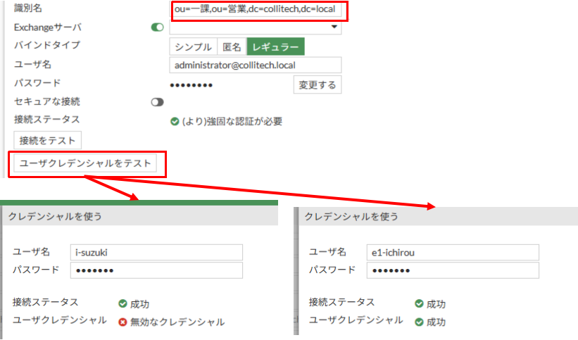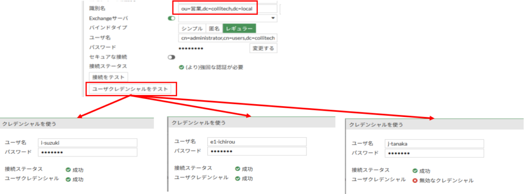テストでは指定しているou=営業配下であればちゃんと成功しますね