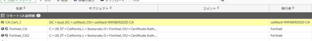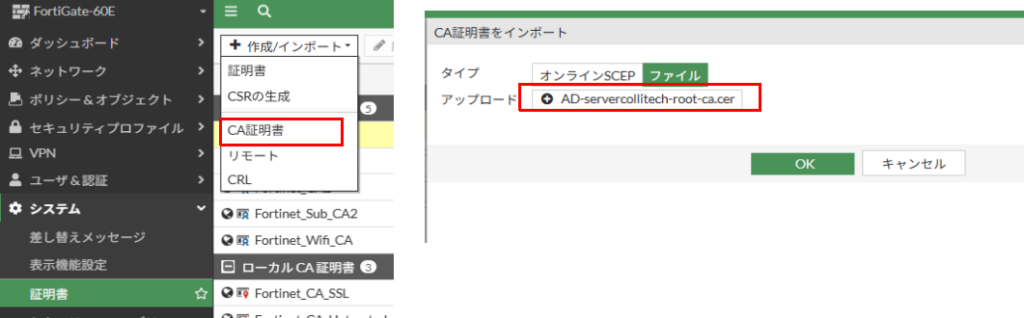 証明書の検証を行うには、FortigateにADサーバのCA証明書をインストールする必要があります