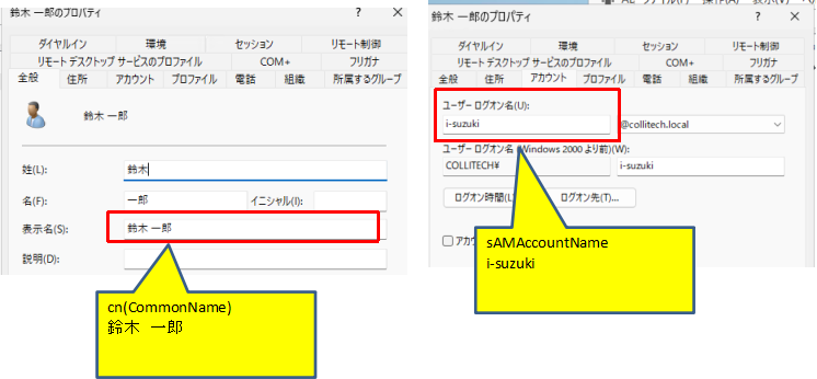 ・sAMAccountName:「i-suzuki」のような英数字のID。一番使用されていて推奨
