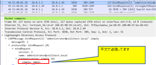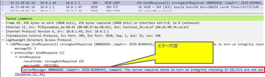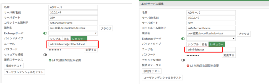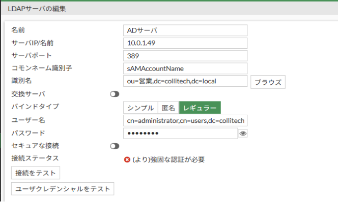 原因はADサーバの仕様で「389番(平文)でパスワードを送ってくるな!」(ポリシーで拒否)と拒否されてました。