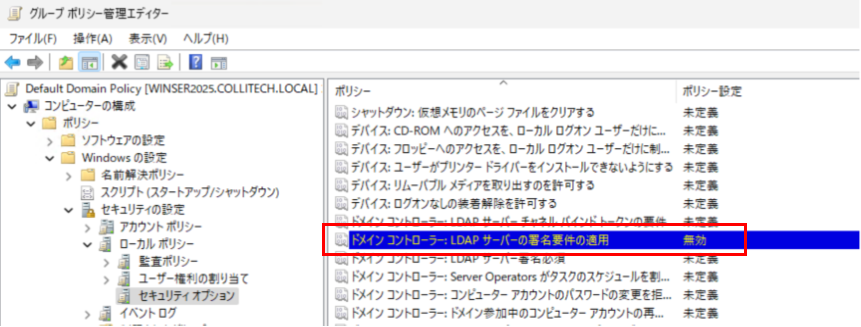 ドメインコントローラー:LDAPサーバの署名要求の適用 を無効にしました