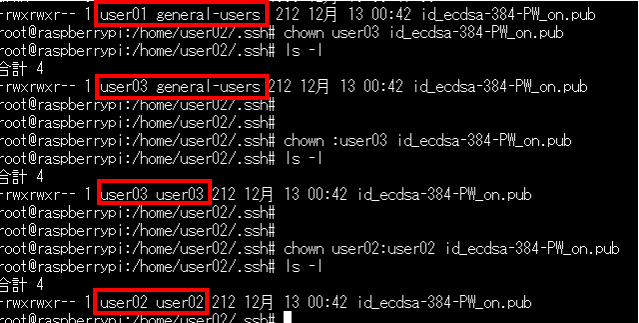 chown 所有者 対象ファイル名 ・・・ 所有者のみを変更