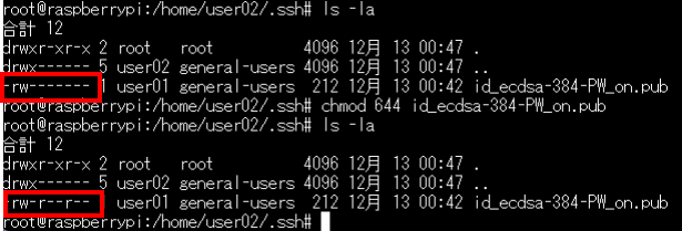 下の例では所有者だけ読書きが出来て、他は読み取りだけ出来るようにしました。